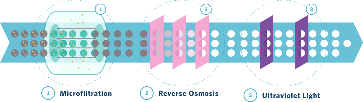 After microfiltration and reverse osmosis, the water is exceptionally clean but as an additional safety measure, the water is sent through chambers that emit ultraviolet light to inactivate any remaining viruses and break down some of the remaining trace contaminants. Ultraviolet light is a powerful disinfection process that produces high-quality water and is highly efficient at destroying pathogens. This technique is also often used to sterilize medical equipment, foods, and fruit juices.